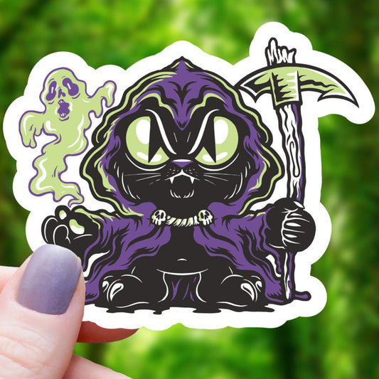 Grim Reaper Black Cat Sticker - Halloween - 3" Waterproof Vinyl Sticker