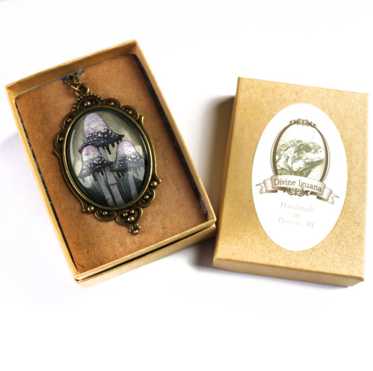 Inky Cap Mushrooms Ornate Pendant Necklace - Oval - Cottage Core