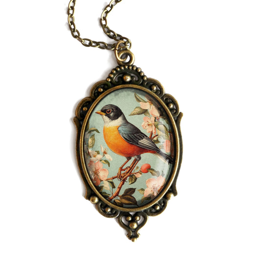 Spring Robin Ornate Pendant Necklace - Oval - Cottage Core