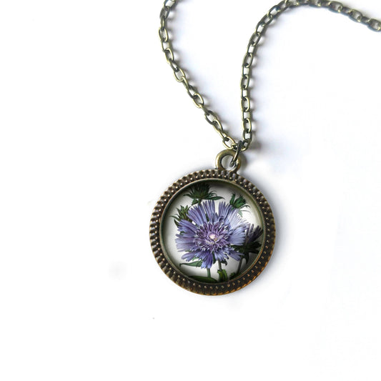 Purple Aster Flower Ornate Pendant Necklace - Cottage Core