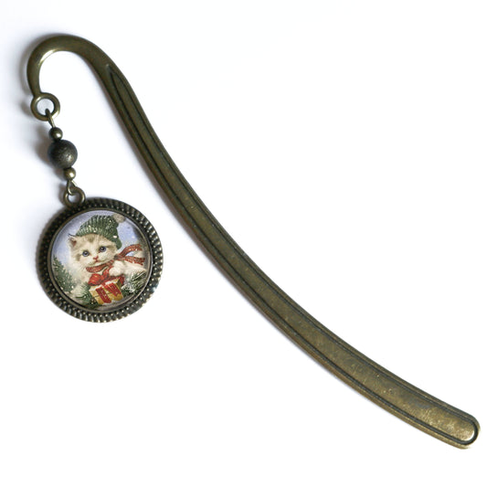 Fluffy Christmas Kitten Bookmark - Winter Holidays- Bronze and Glass Cabochon