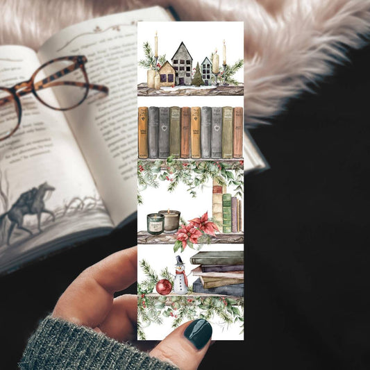 Christmas Bookshelf Watercolor Cardstock Bookmark - Festive Holidays & Winter