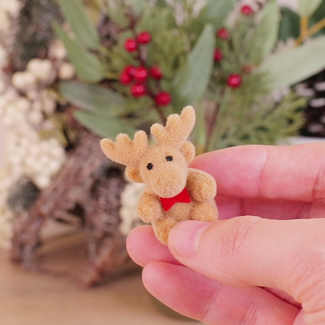 These 1.25" sweet baby reindeer flocked miniatures lend a touch of festive holiday season to Christmas and winter projects. Decorate your doll house with these velveteen miniatures or use them to embellish a Christmas party or display. The options are endless for these cute brown reindeer.