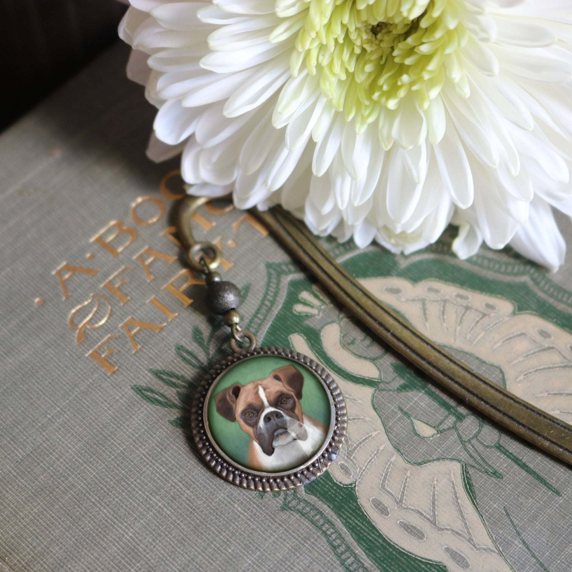 Boxer Dog Bookmark - "Best Friends" - Bronze and Glass Cabochon Book Hook