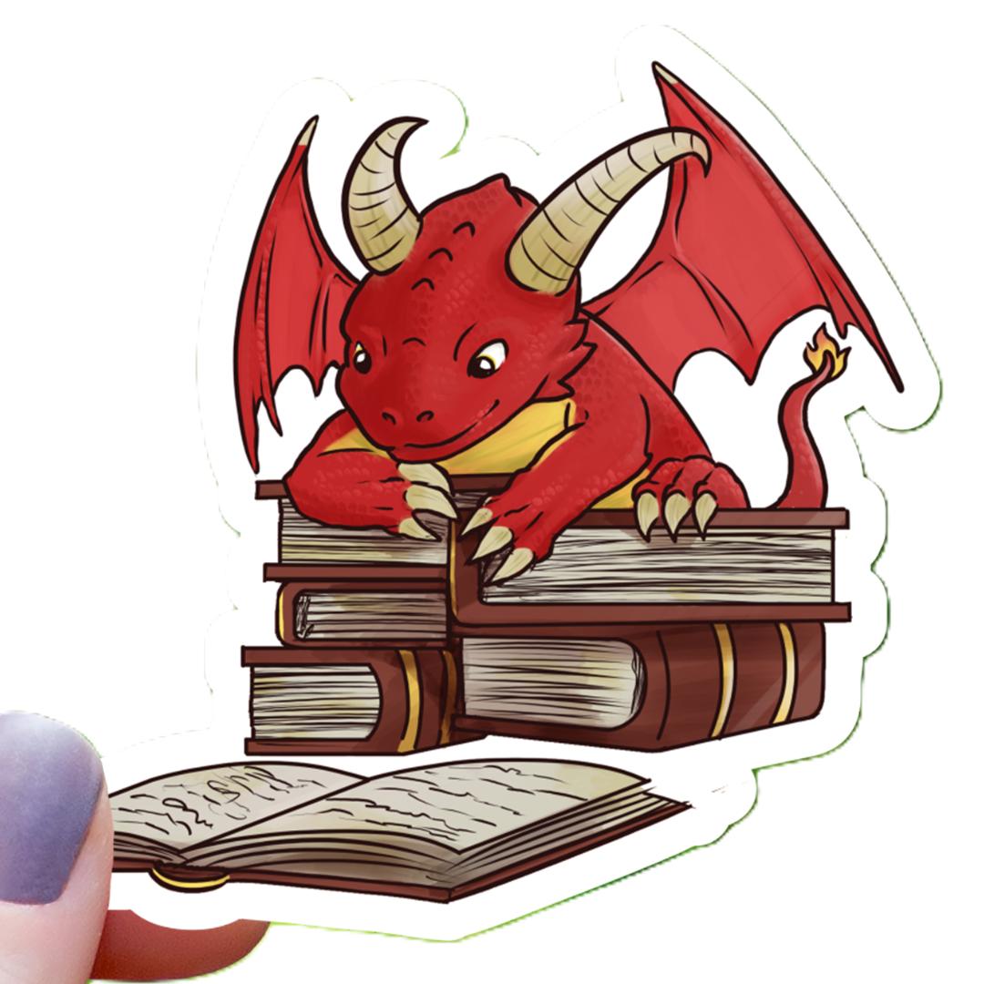 Book Reading Red Dragon Fantasy Sticker - 3" Waterproof Vinyl Decal