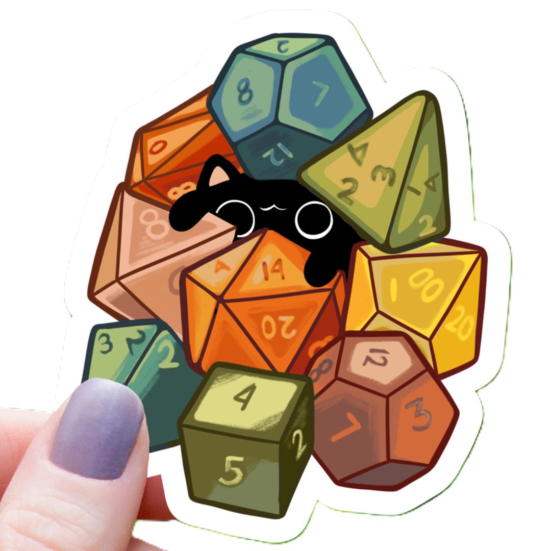 Cat Amongst Polyhedral Dice RPG Sticker - 3" Waterproof Vinyl Decal