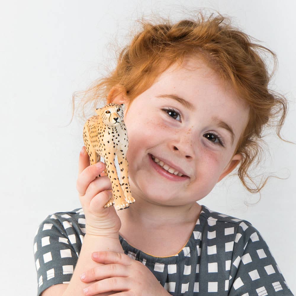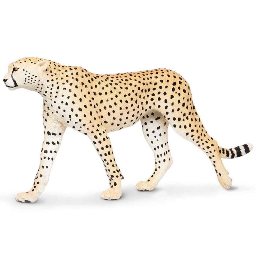 Characteristics: Known for their spotted pelt as well as their black facial markings, our expertly painted and true-to-life cheetah toy figurine captures the natural beauty of this incredible hunter.