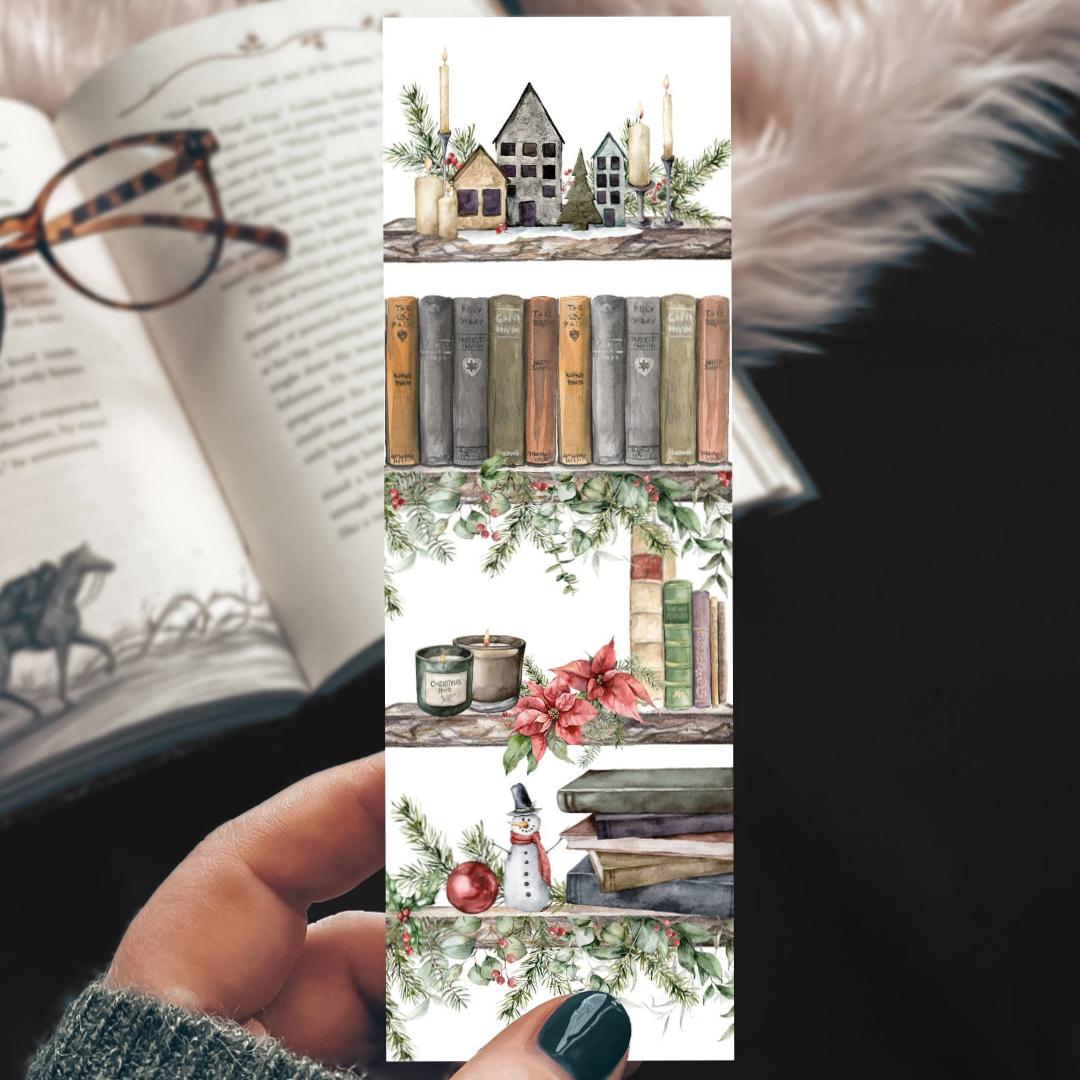 A festive decorated Christmas Bookshelf watercolor bookmark.