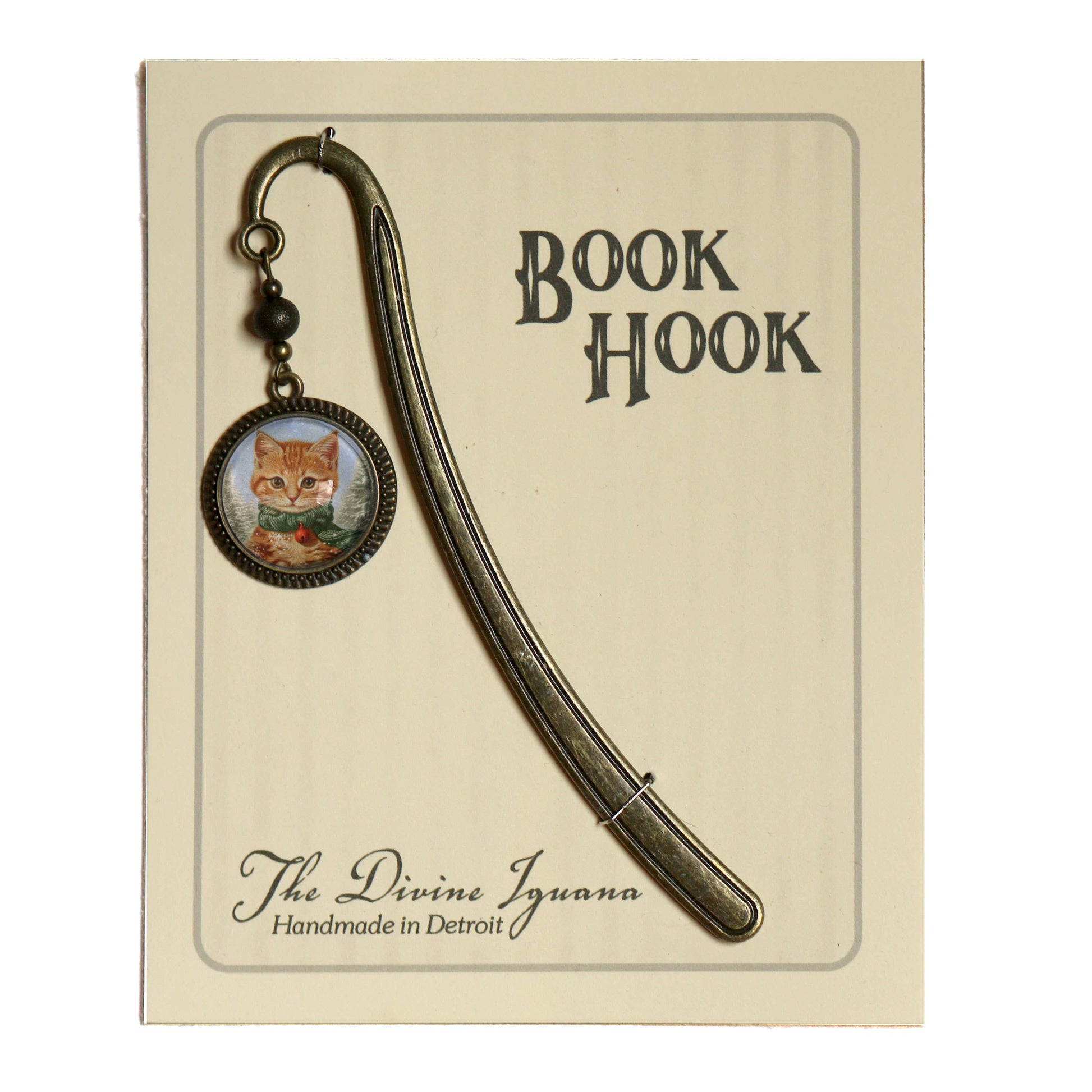 This handmade Terrier puppy in a red bow book hook has vintage appeal and brings forth the spirit of winter and Christmas. The hook is made of a sturdy iron alloy with an antiqued bronze finish and comes with a dangling accent that will add a touch of personalized decor to your bookshelf. In addition to books, these bookmarks show nicely using a shoebox, basket, or small drawer as a flip bin. The book hooks work by sliding the long metal shaft down between the pages of your book like a traditional bookmark, allowing the accent to dangle along the spine.