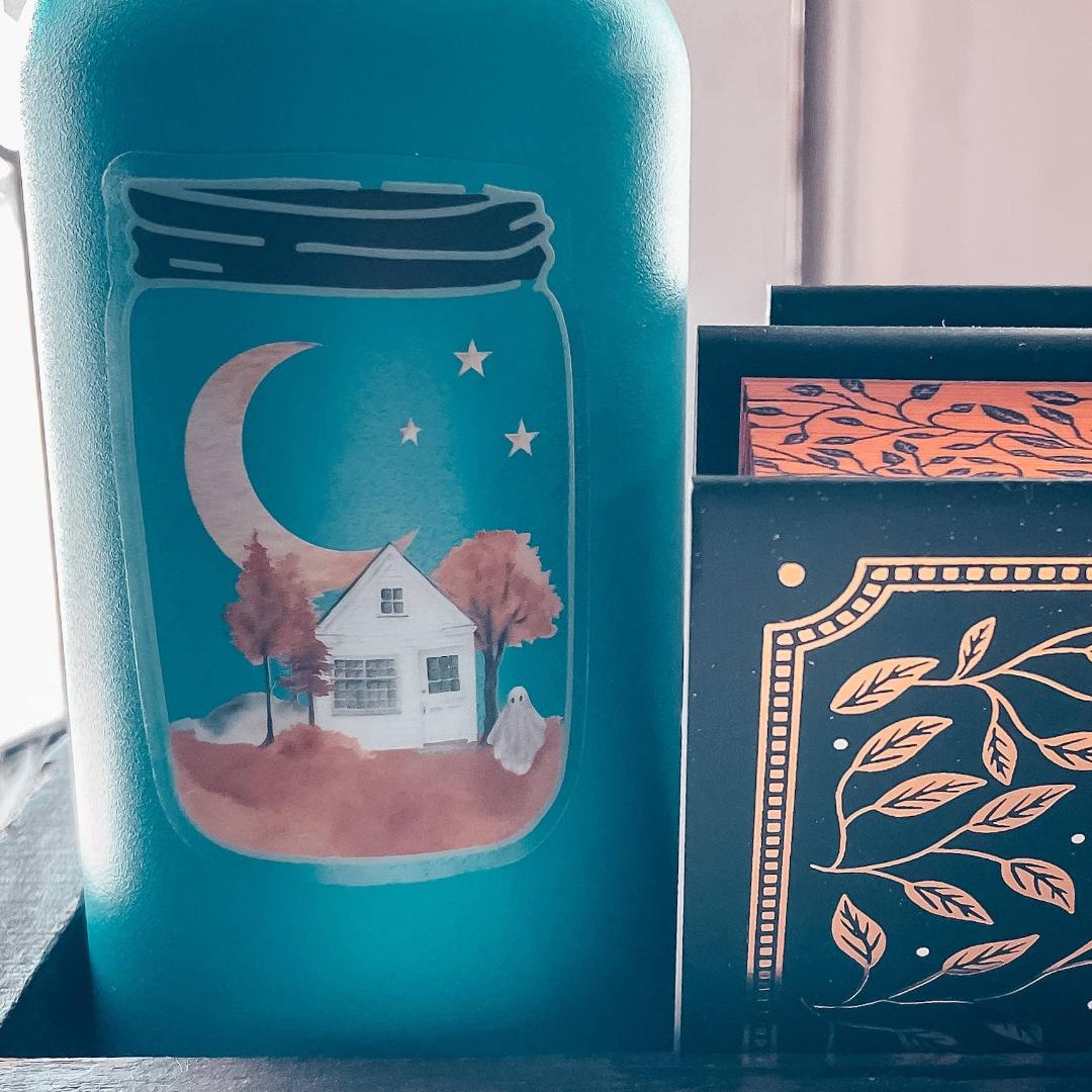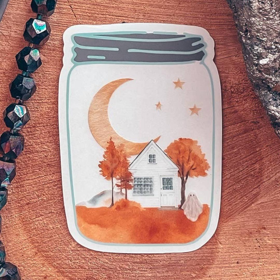 This sticker has a clear background and a fall landscape inside a jar. The moon rises and a cute spooky ghost visits the front yard. Perfect for a laptop, kindle, or water bottle. The sticker is durable and resistant to scratches, water, and sunlight for long-term use. Comes with a white backing that can be removed before sticking to reveal the transparent background.