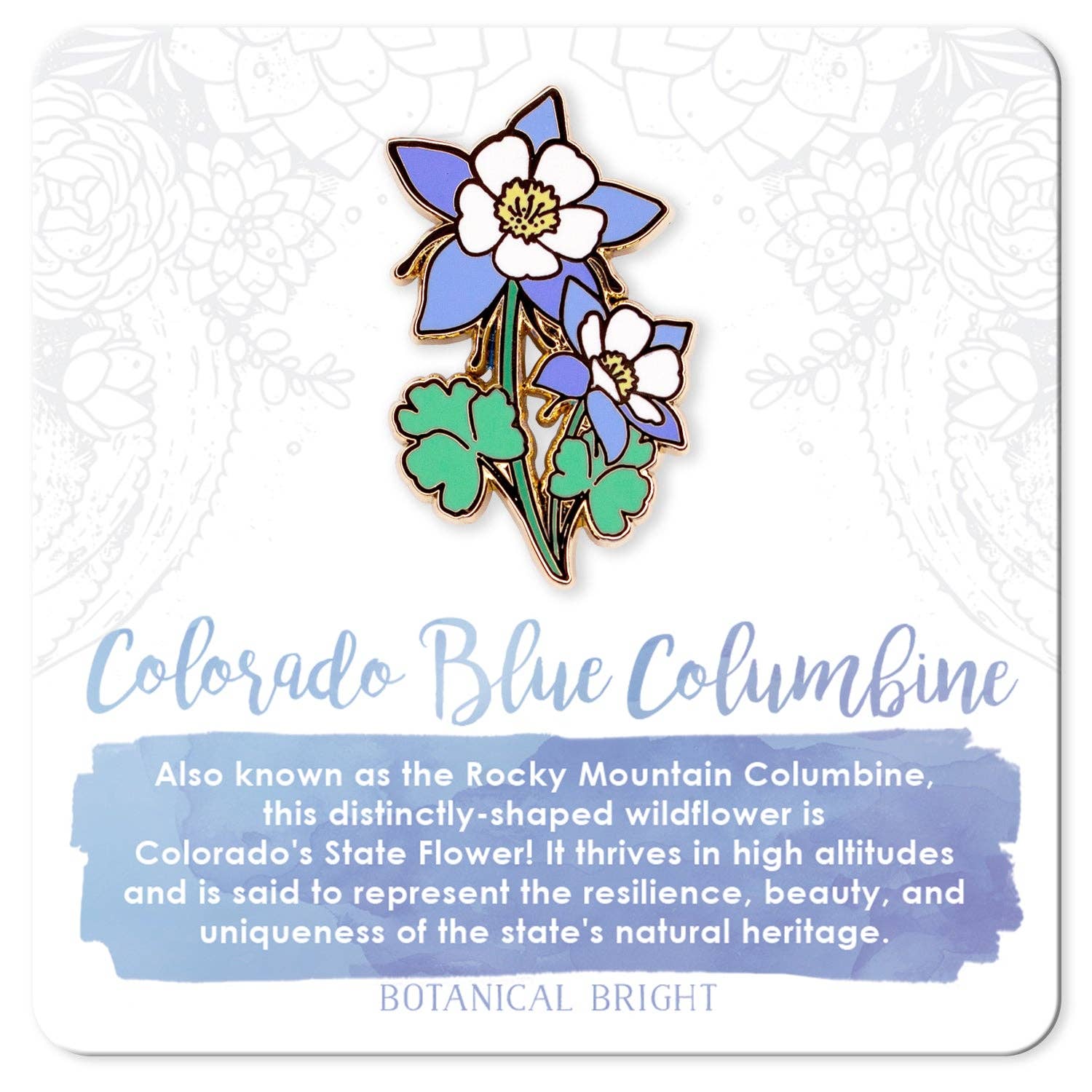 This is a high-quality and well-detailed enamel pin of a Colorado Blue Columbine Flower. There are two clasps on the back for securing the pin and preventing rotation. Each pin is about 1.25" inches tall and is packaged on its own meaning card. The pin and meaning card are further packaged in a clear plastic sleeve. The base metal is zinc alloy and is plated with gold. This is a Grade A Pin, the highest grade awarded to pins, meaning that it doesn't have any noticeable flaws.