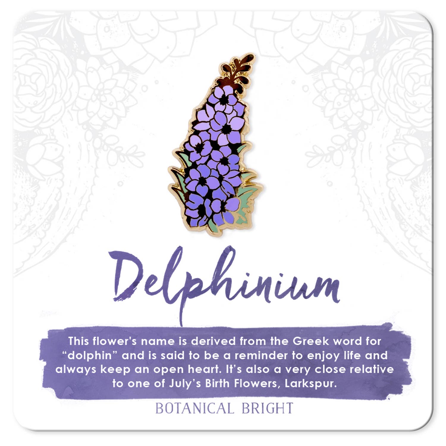 This is a high-quality and well-detailed enamel pin of a Delphinium Flower. There are two clasps on the back for securing the pin and preventing rotation. Each pin is about 1.25" inches tall and is packaged on its own meaning card. The pin and meaning card are further packaged in a clear plastic sleeve. The base metal is zinc alloy and is plated with gold. This is a Grade A Pin, the highest grade awarded to pins, meaning that it doesn't have any noticeable flaws.
