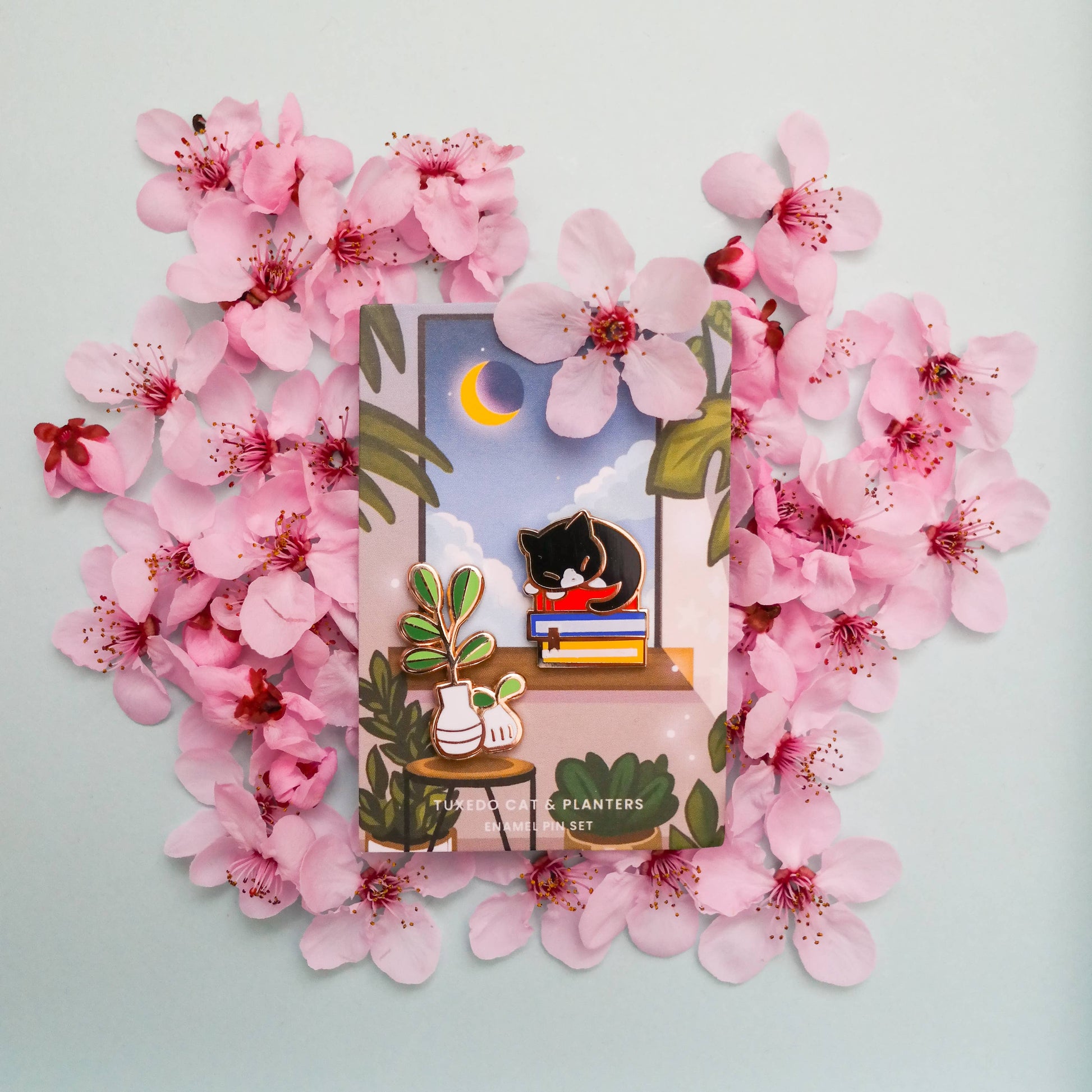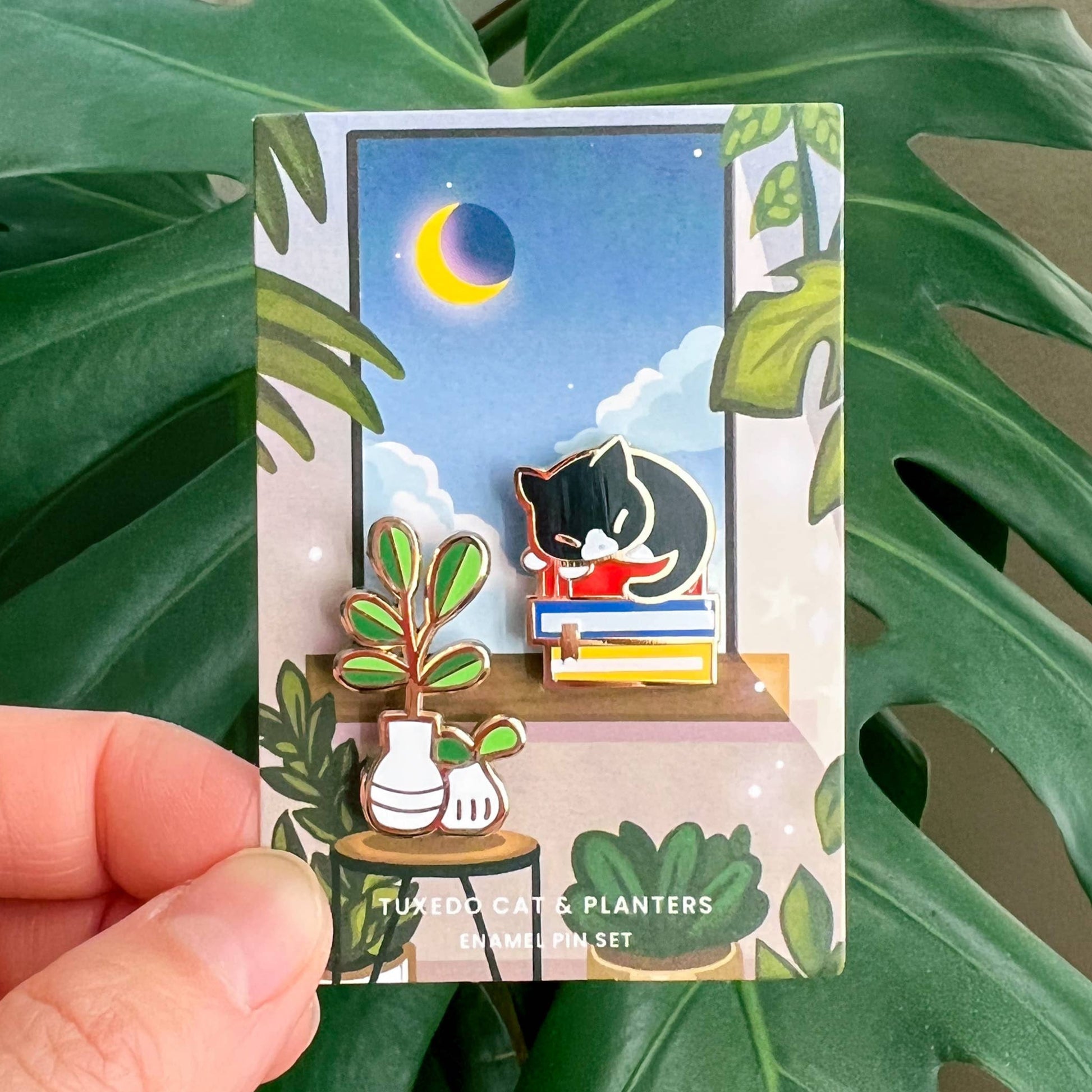 This is a high-quality and beautifully detailed enamel pin set of two enamel pins: a tuxedo cat sleeping on books & planters. Each pin has a butterfly clasp on the back.