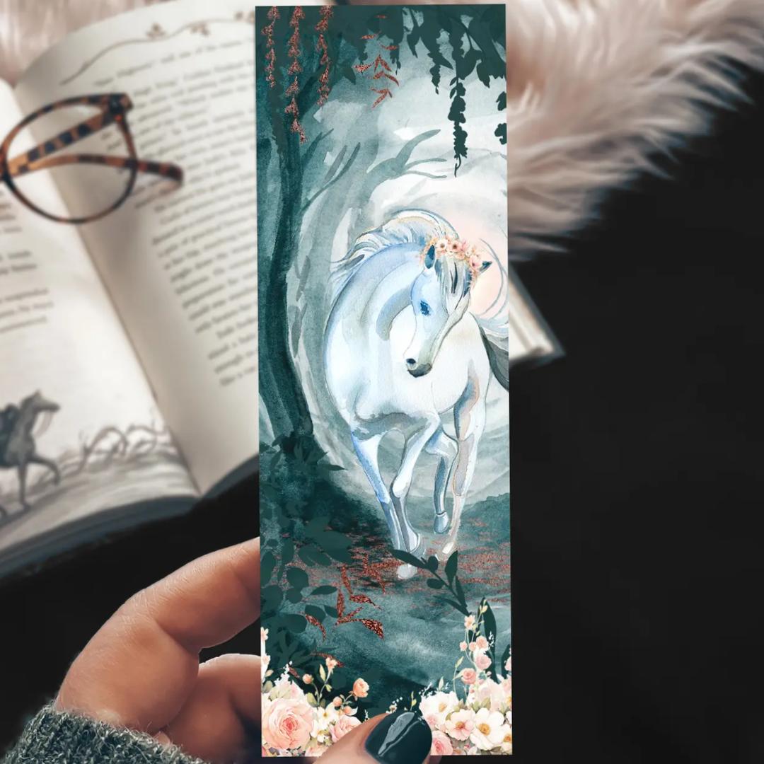 The cardstock bookmark features a beautiful white horse in the enchanted forest.
