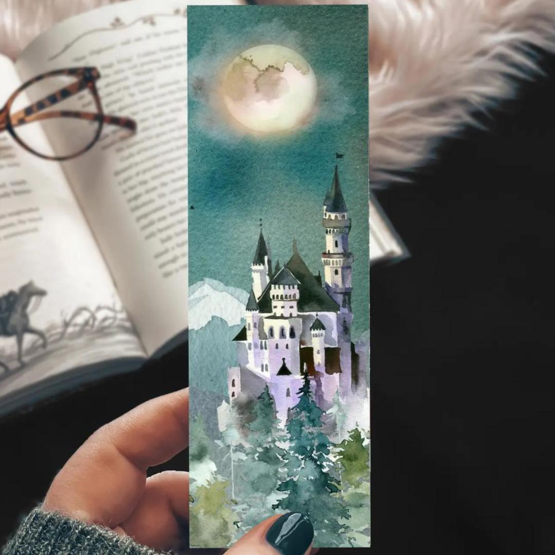 This bookmark features a watercolor scene of a magical castle in a fantasy forest.