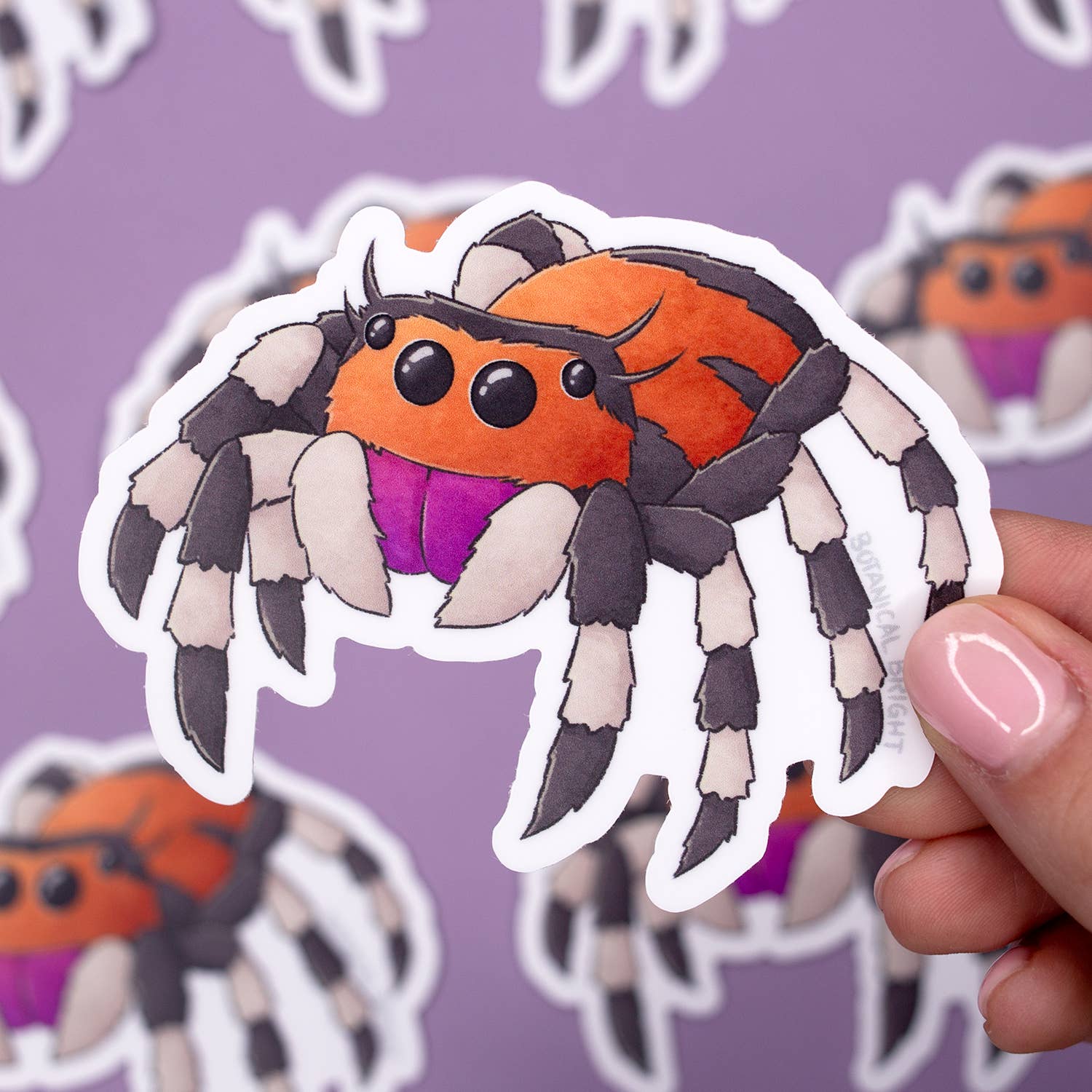 This is a high-quality, large, and well-detailed Jumping Spider Sticker. These stickers are made of a vinyl waterproof material and are dishwasher safe. Each sticker measures approximately 3.4" x 2.6" inches.