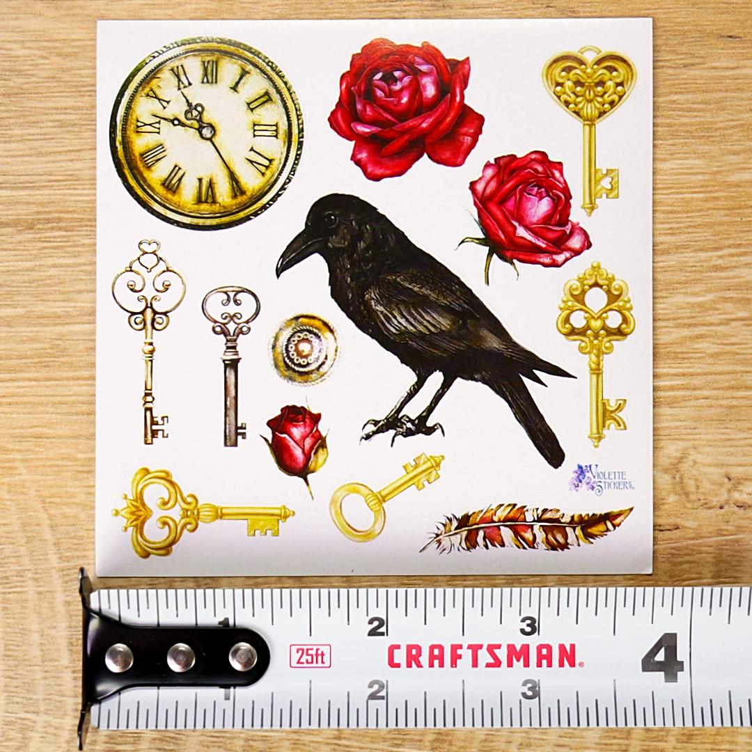 Mystical gold keys, pocket watch, red roses and raven sticker sheet.