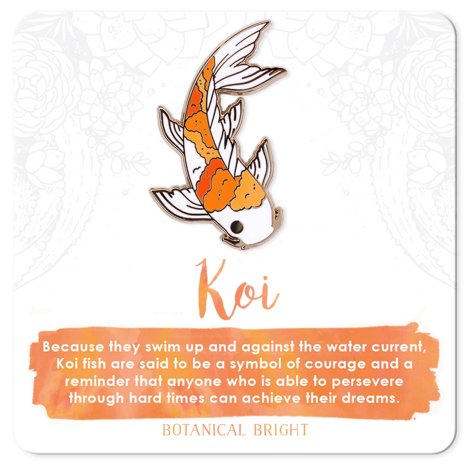 This is a high-quality and well-detailed enamel pin of a Koi Fish. There are two clasps on the back for securing the pin and preventing rotation. Each Pin is about 1.5" inches tall and is packaged on its own meaning card. The pin and meaning card are further packaged in a clear plastic sleeve. The base metal is zinc alloy and is plated with gold. This is a Grade A Pin, the highest grade awarded to pins, meaning that it doesn't have any noticeable flaws.