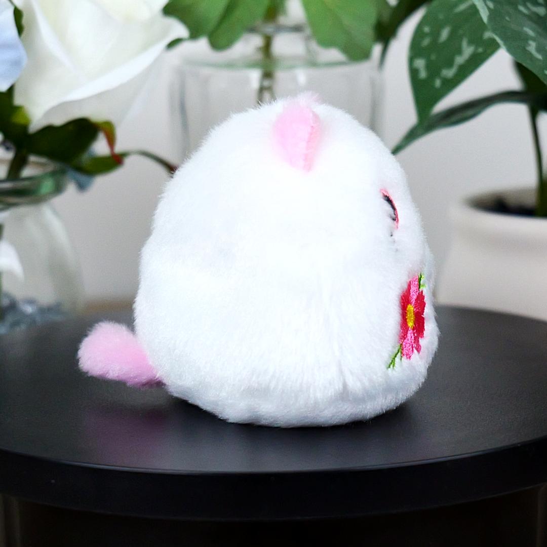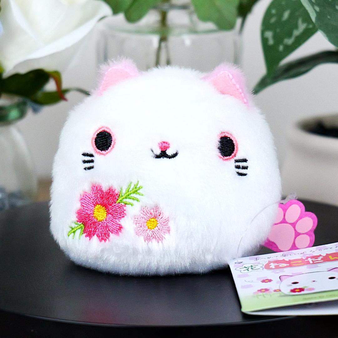 This is an extremely soft roly-poly cat beanbag plush by Sanei Boeki, which was imported from Japan. This plush is as round as a ball, other than the ears and tails, and has embroidered cosmos flowers on its white fur. He fits nicely into the palm of your hand and makes a perfect collectible or gift for spring. This kawaii cat is made of polyester and measures 2.8"H x 3"W x 2.4"D inches.