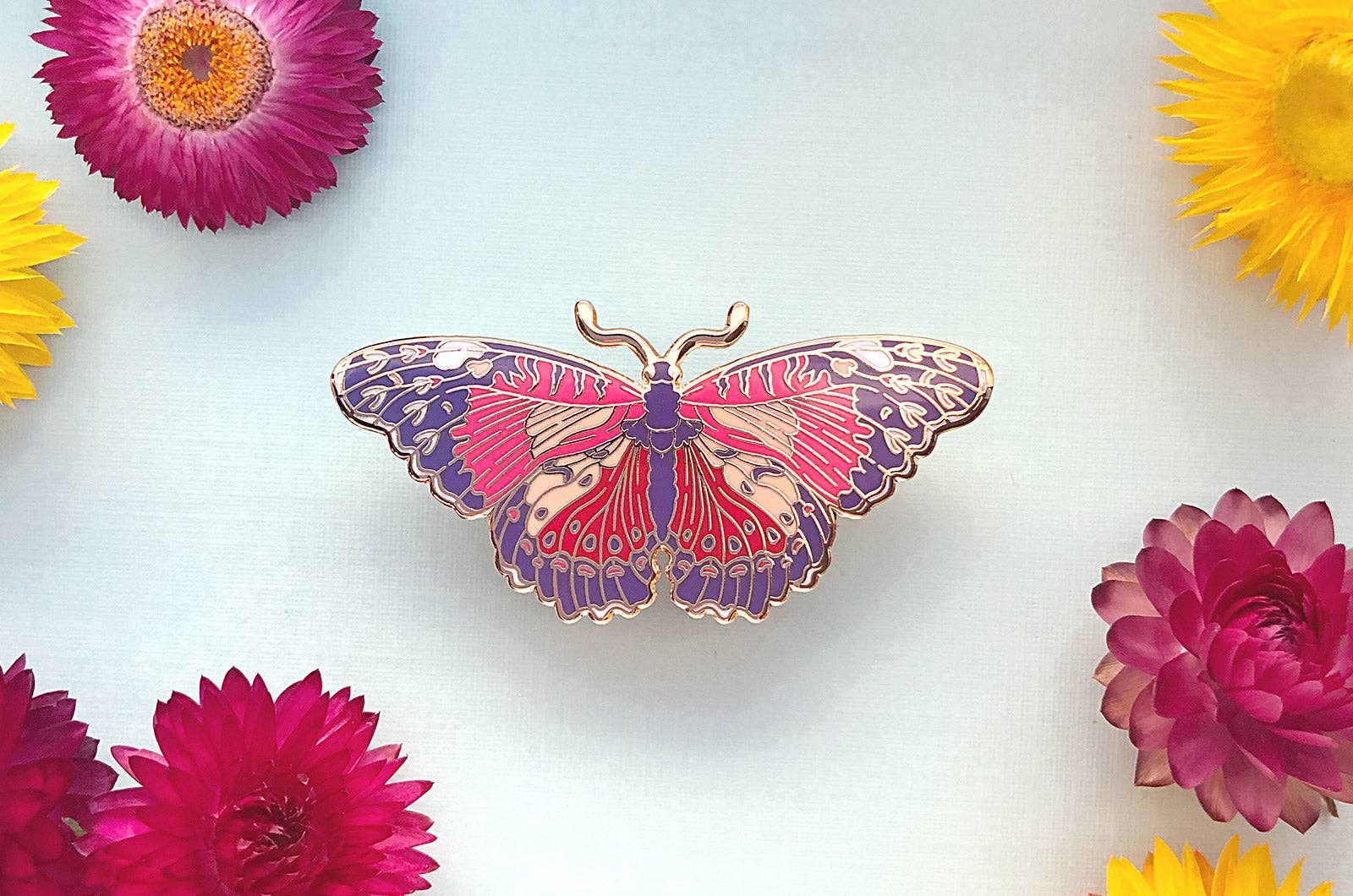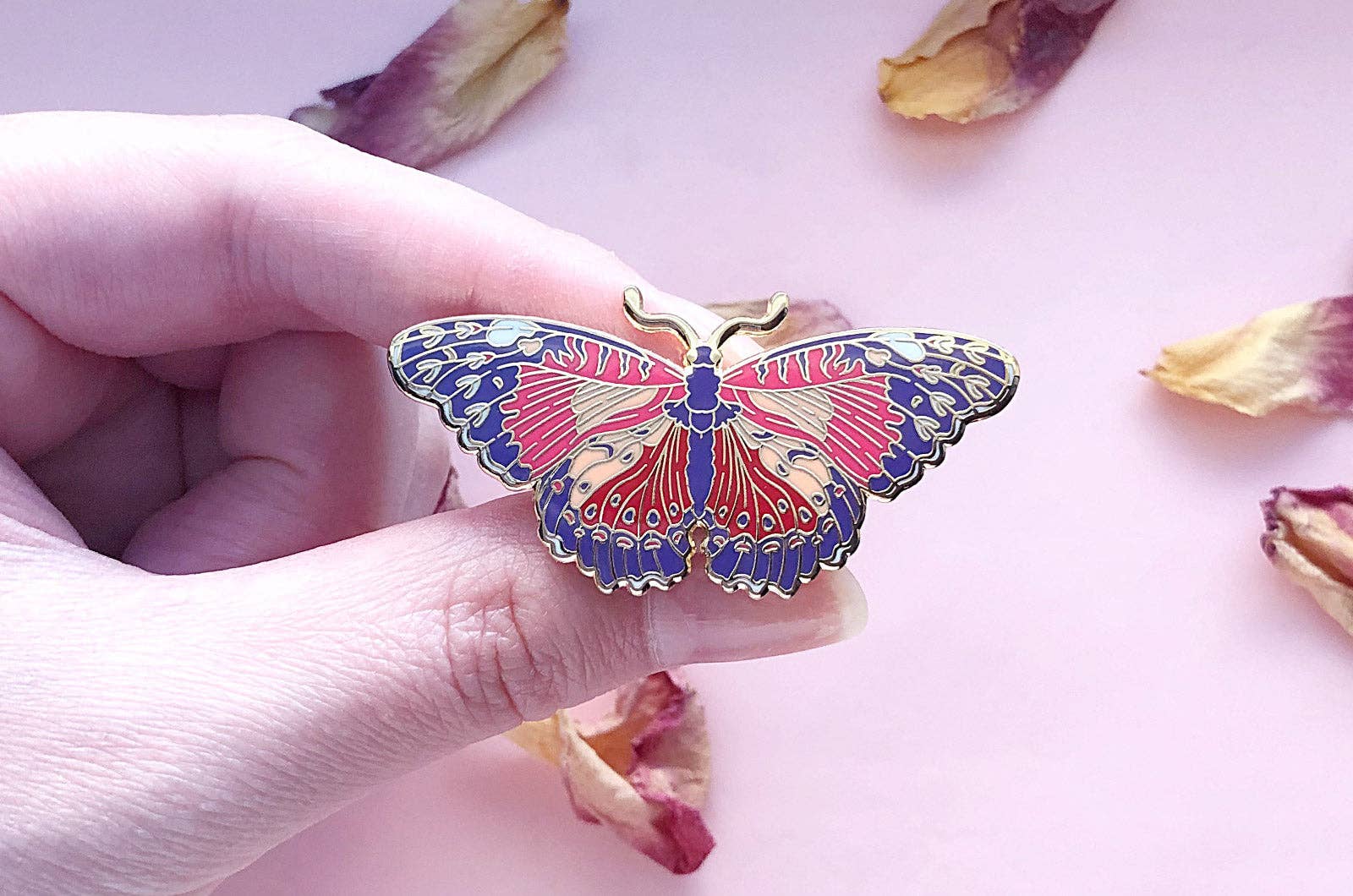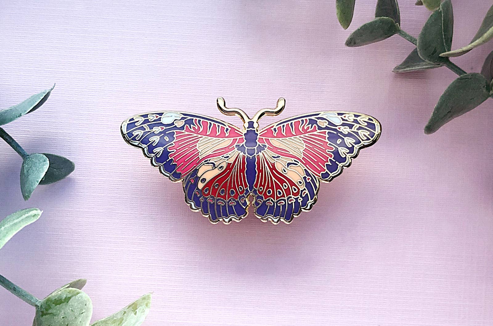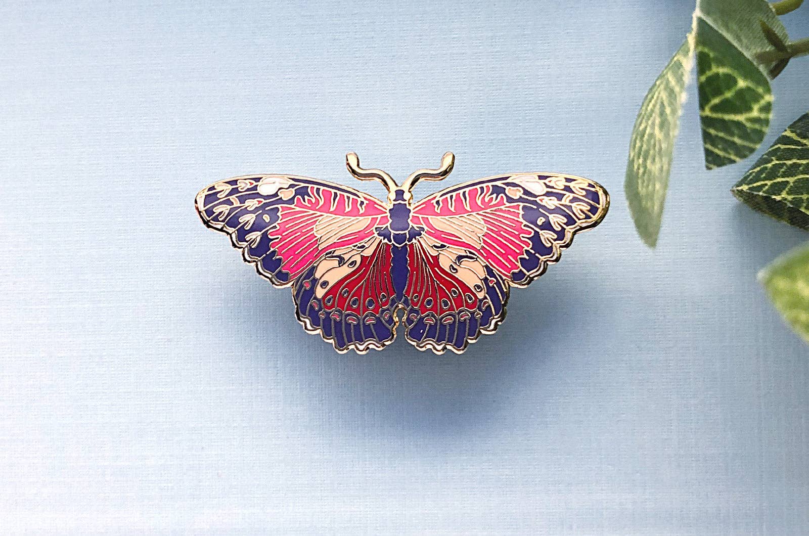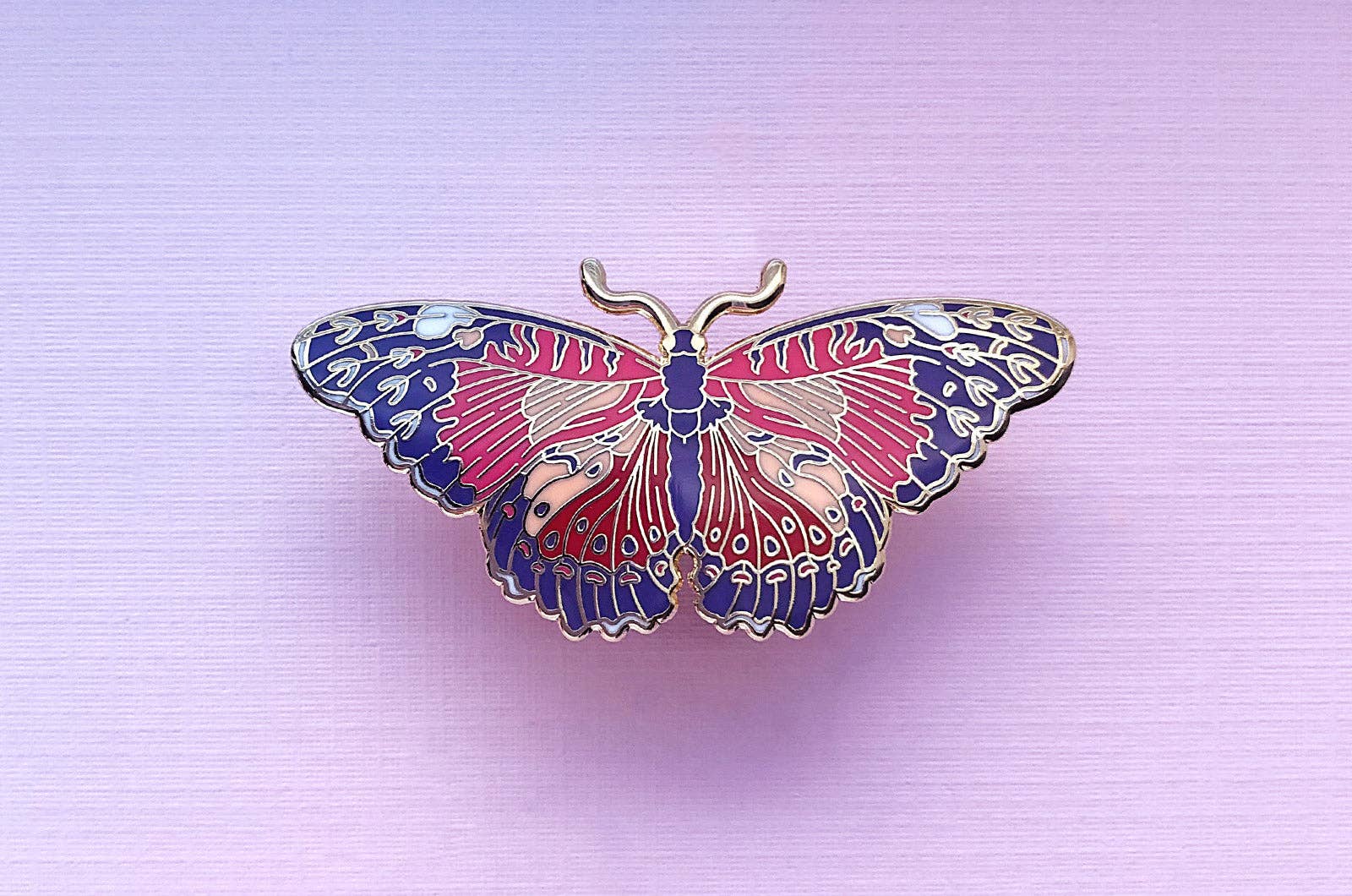 This beautiful Red Lacewing Butterfly enamel pin depicts the stunning insect with its full array of colors used to warn off predators. Red Lacewings (Cethosia biblis) are found in the Indian subcontinent, South-East Asia, and East Asia. This hard enamel pin is 1.5" from tip-to-top and is set on a highly polished gold-plated metal. This is a Grade A Pin, the highest grade awarded to pins, meaning that it doesn't have any noticeable flaws.