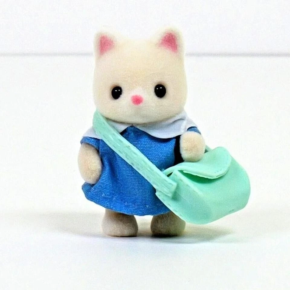 This listing is for a like new, single Sylvanian Families Nursery Playmates Silk Cat Baby named Gilly. She measures at approximately 1.75" tall and is posable with removable clothing. She also comes with a wearable green bag. Gilley was imported from Japan.