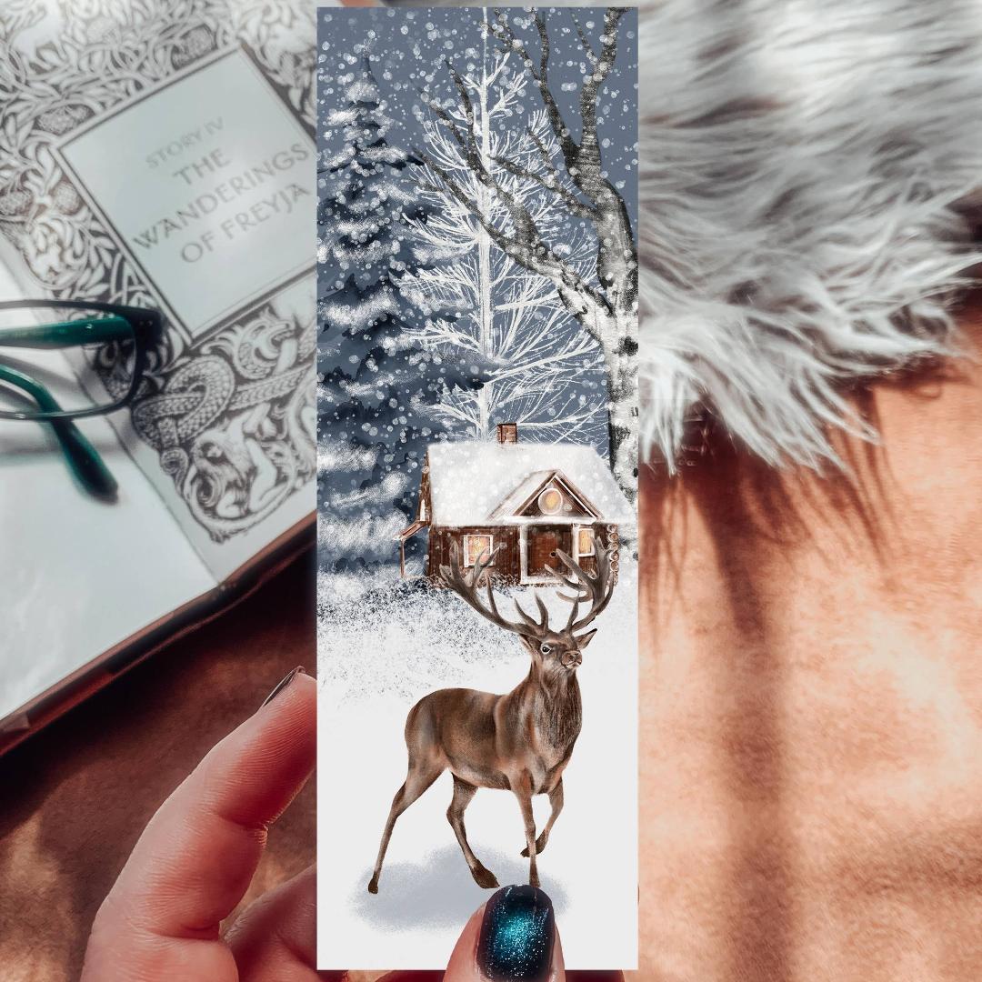 Christmas Deer & Cabin Watercolor Bookmark - Snowy Winter Scene - Cardstock